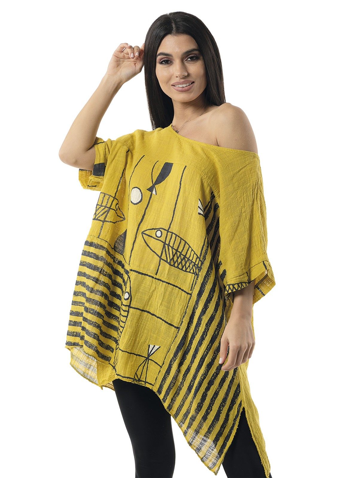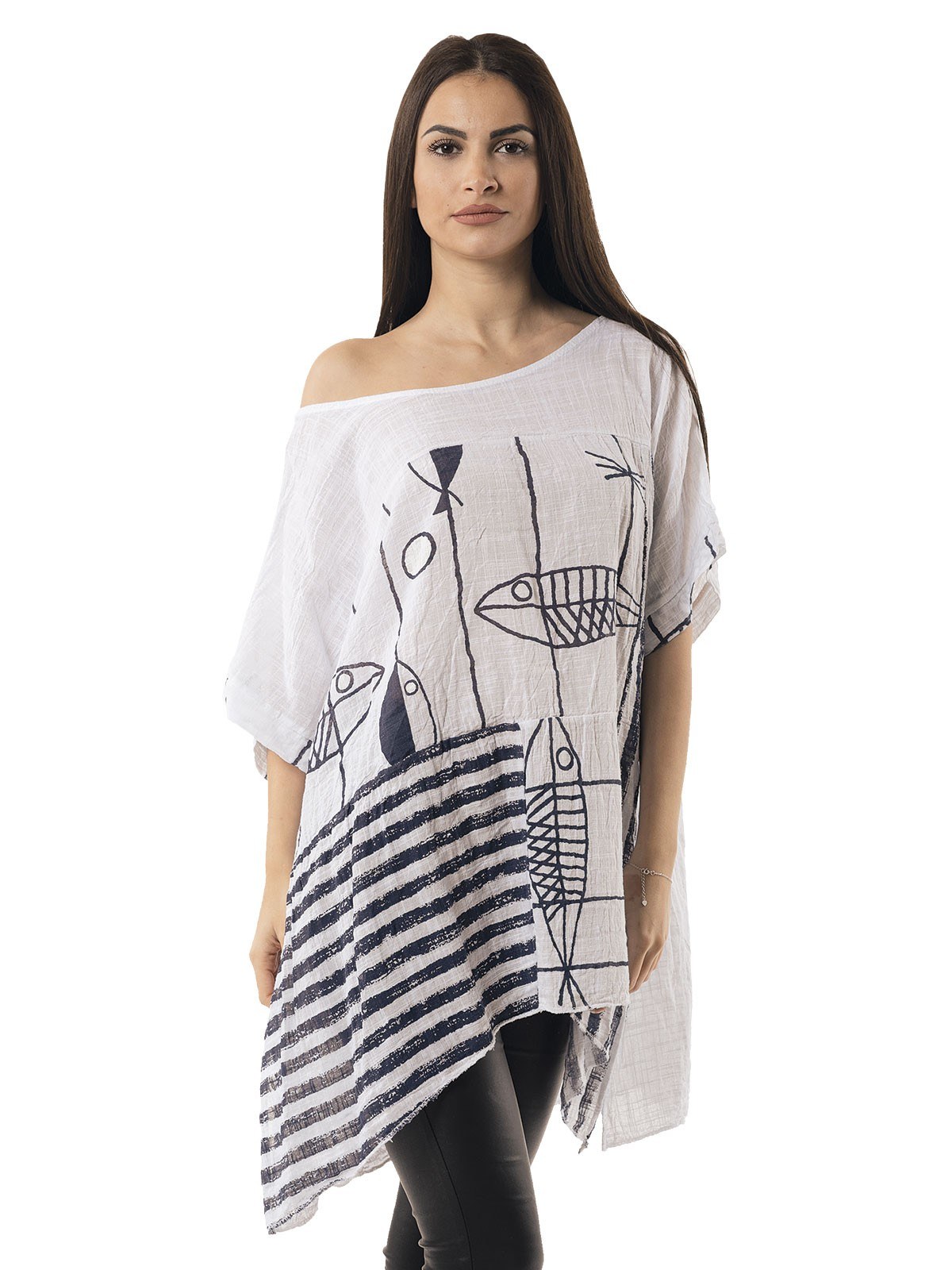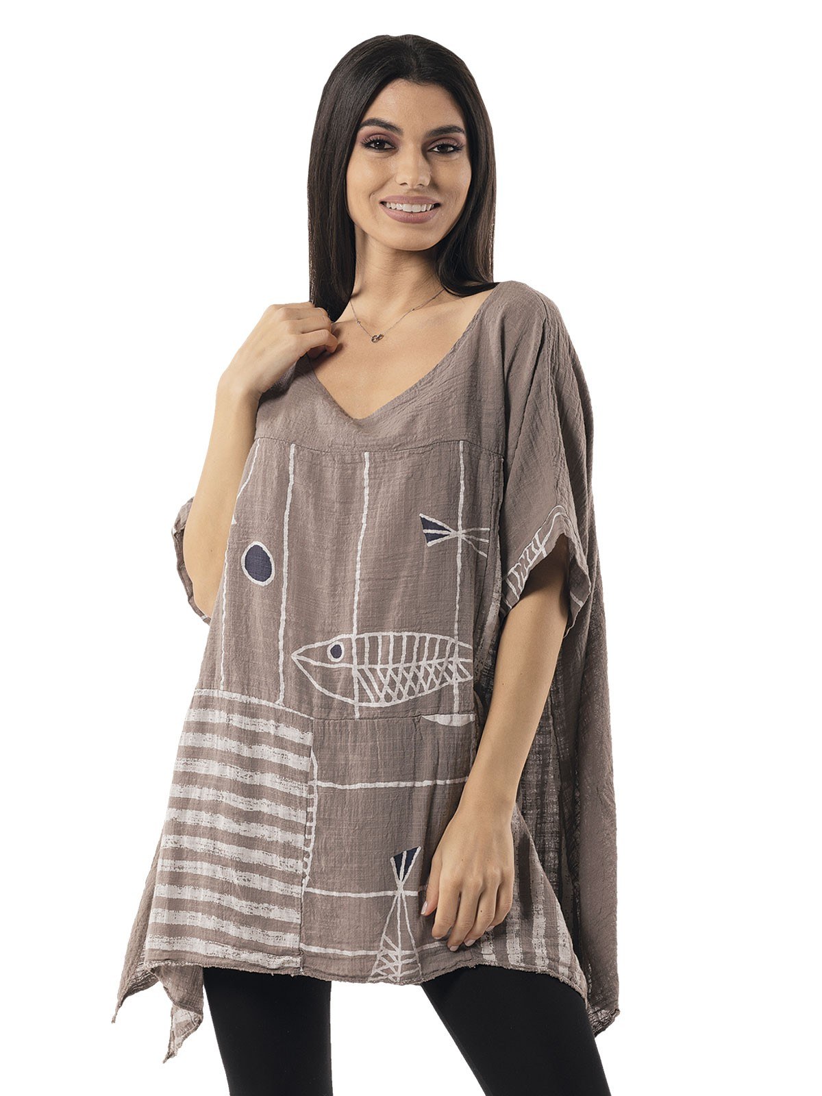 Blouse with fish design, sleeves and small side slits. 100% cotton