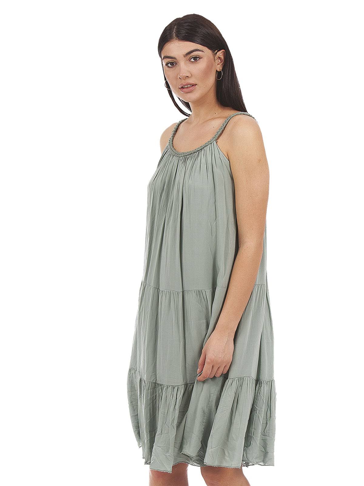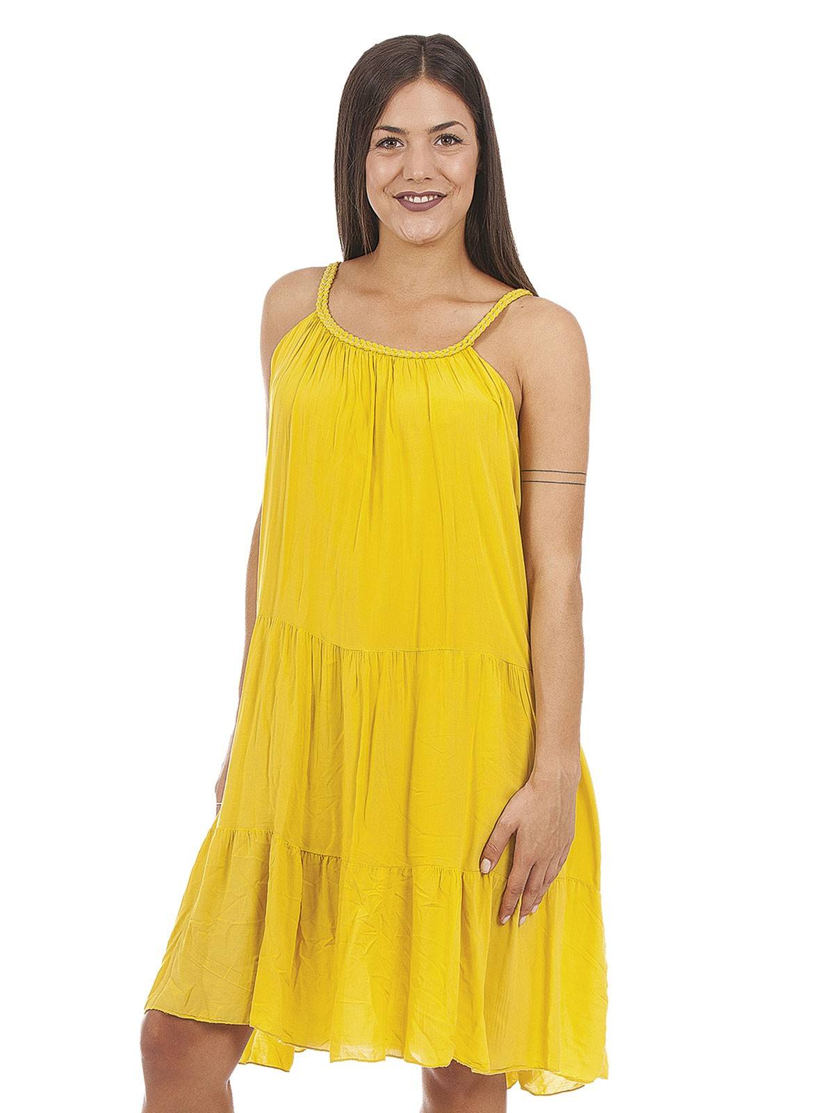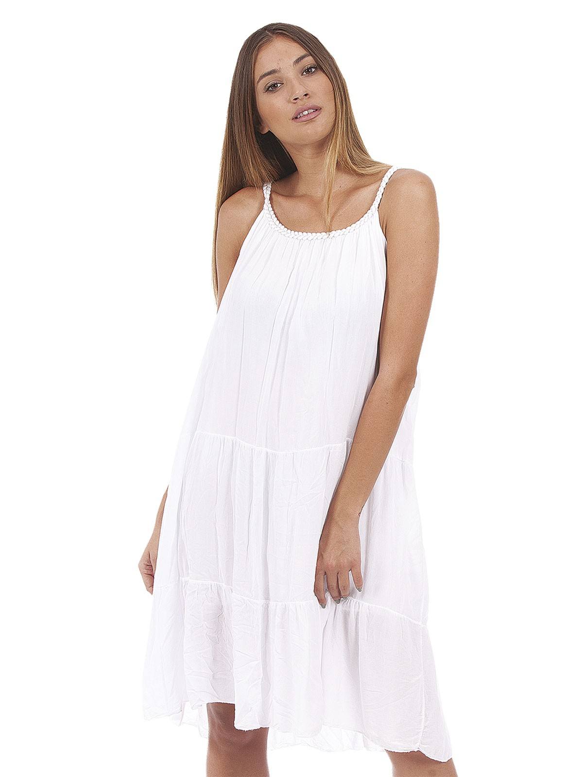 Plain dress with embroidery on the straps and with ruffles. 100% viscose