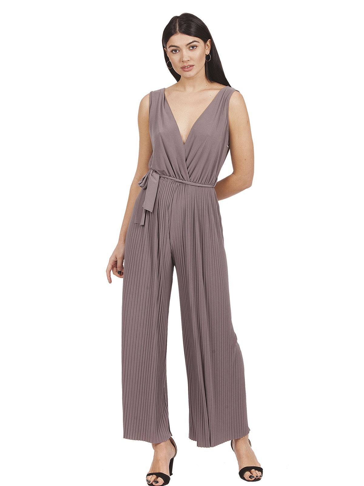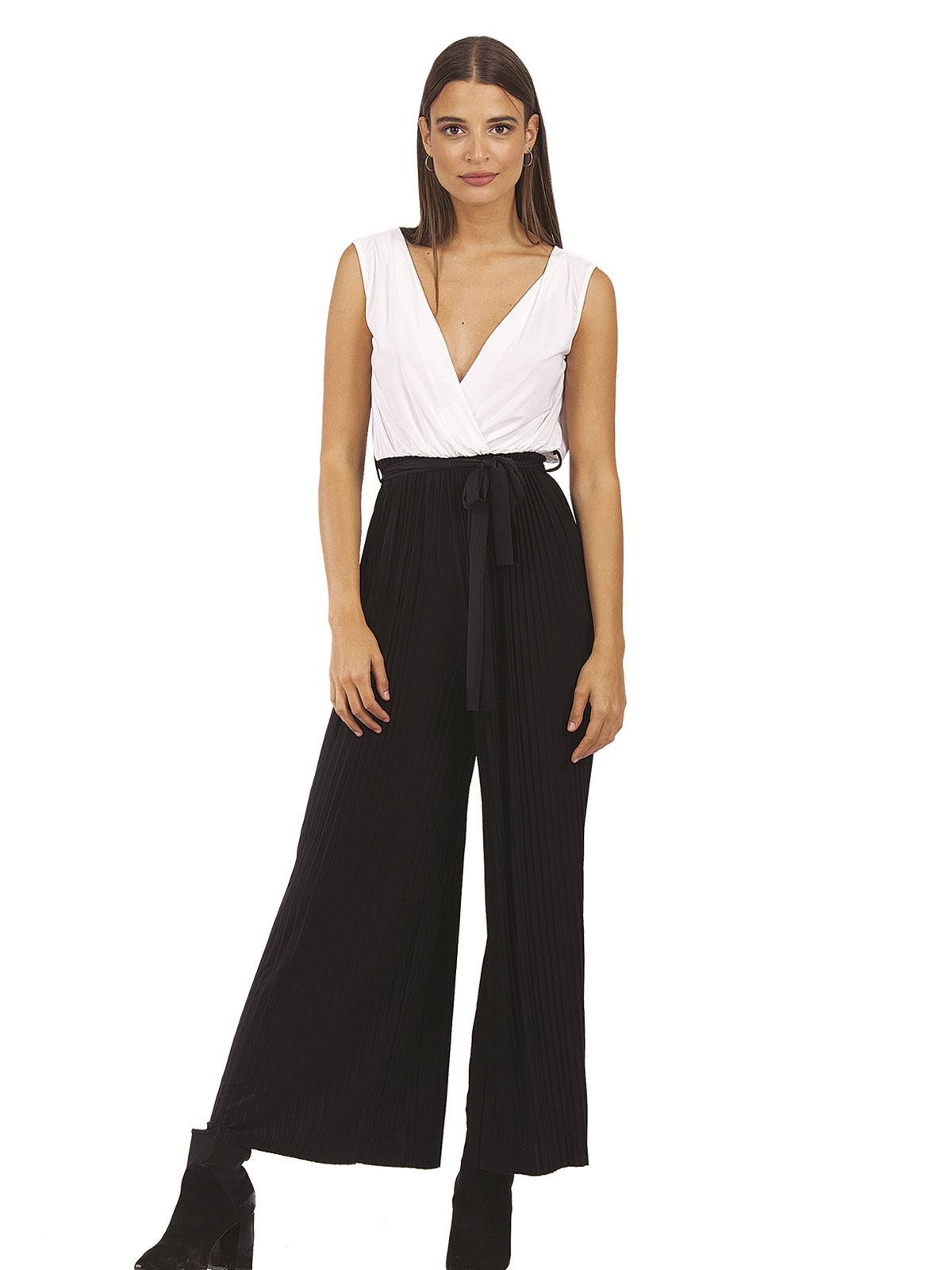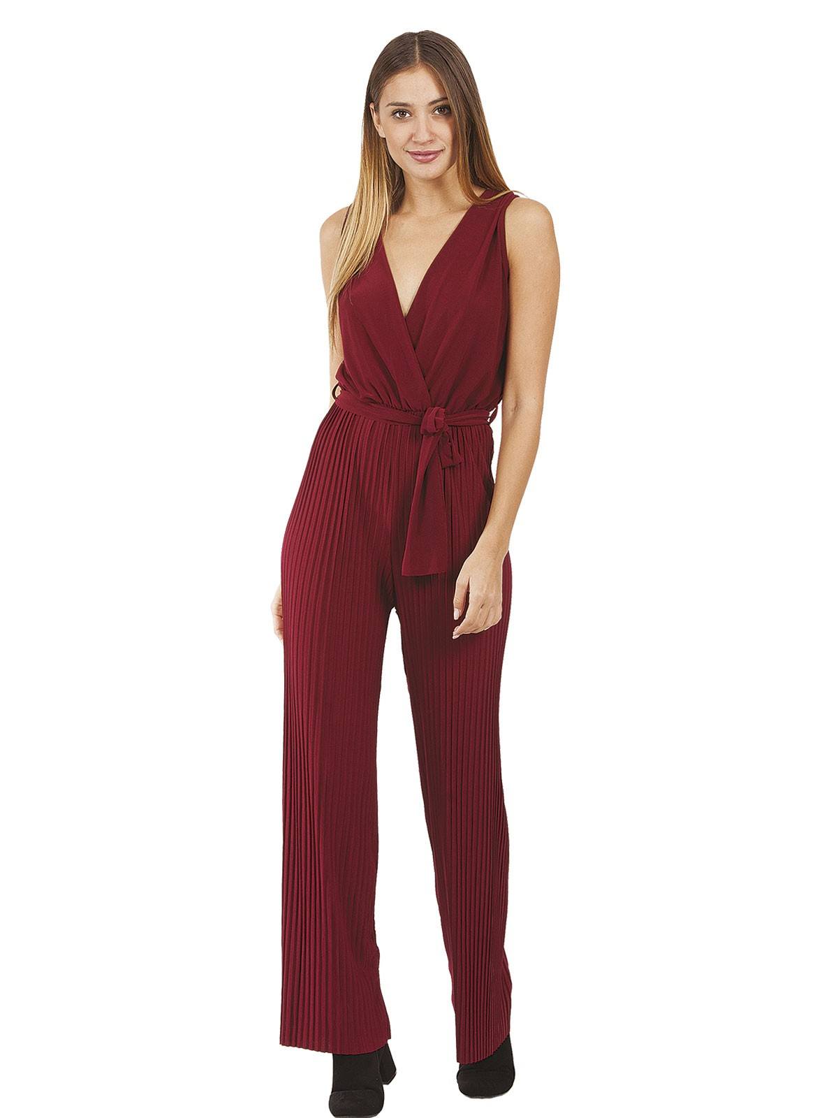 Jumpsuit, sleeveless with tie in the middle and the bottom is pleated. 95% polyester, 5% elastane