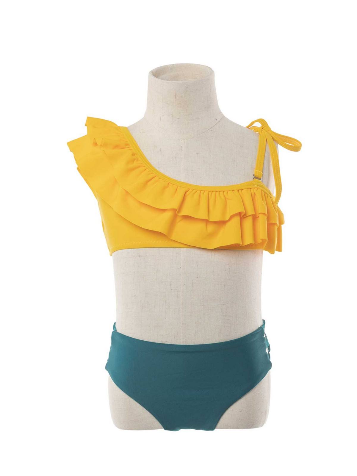 Kids’ bikini set Two-colored, with Yellow bustier with ruffles, thin adjustable straps and Petrol briefs. 80% polyester, 20% spandex