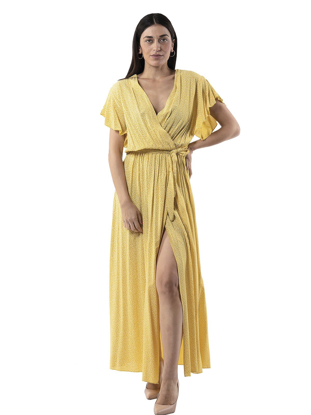 Wrap front long floral dress with ruffles on the sleeves, with tie in the middle and opening on the bottom. 100% rayon