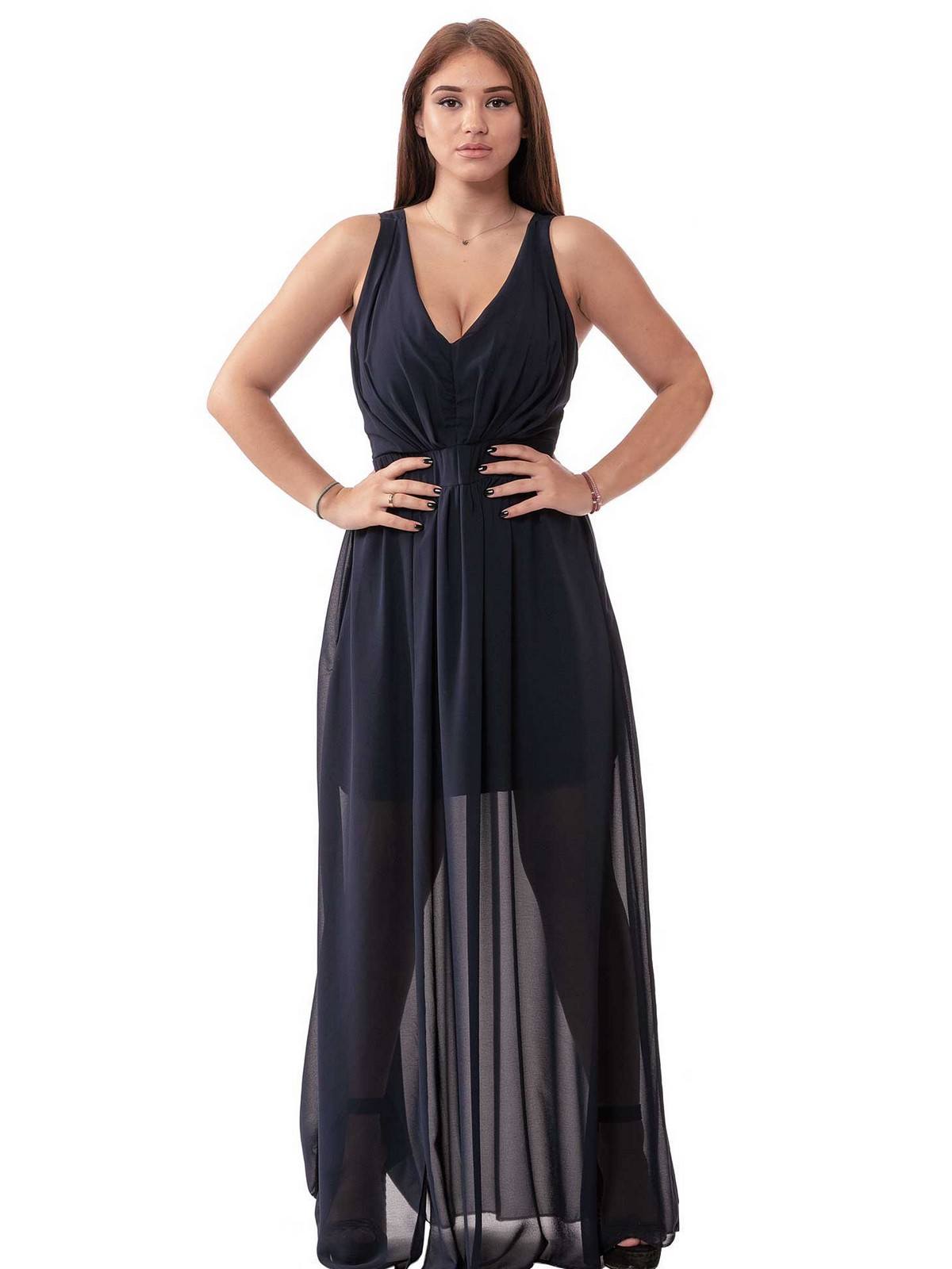 Long dress Dark Blue, sleeveless with V neckline and side slits. It has lining. 60% polyester, 35% viscose, 5% elastane