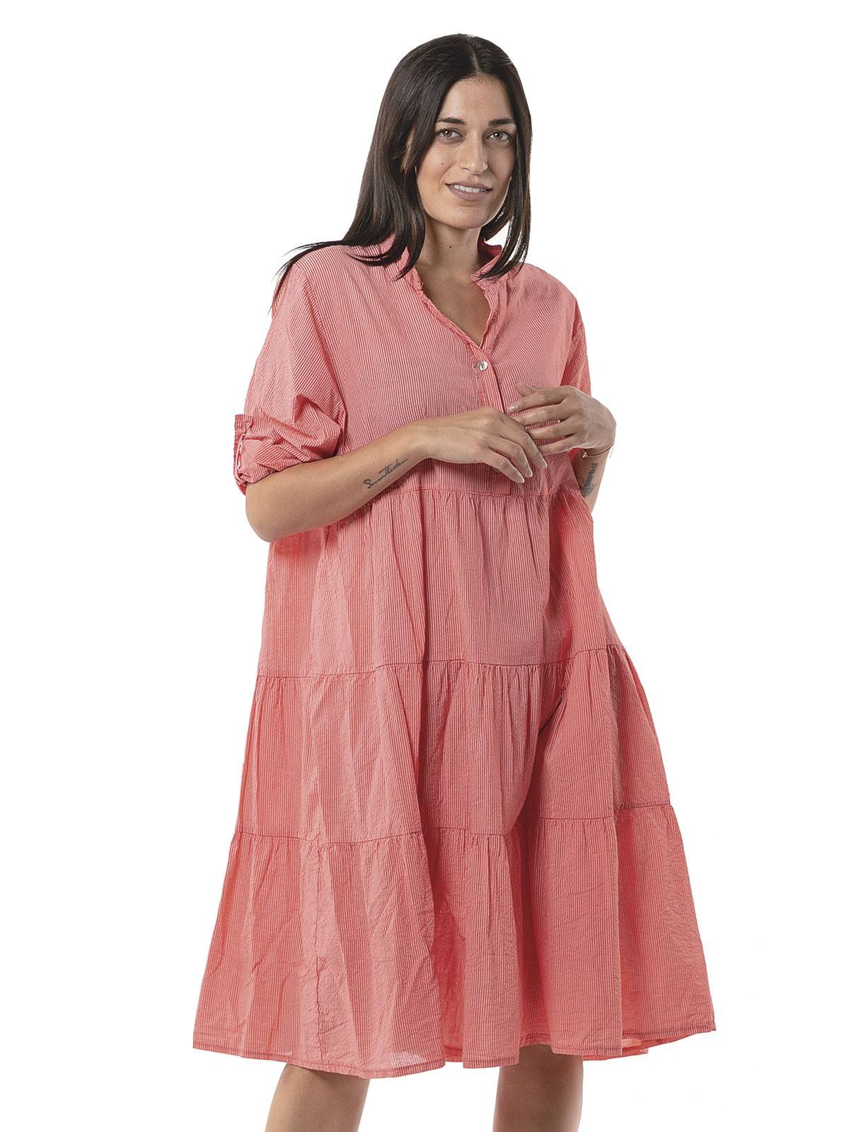Striped midi dress, with 3/4 sleeves, buttons at the chest and ruffled hemline. 100% cotton