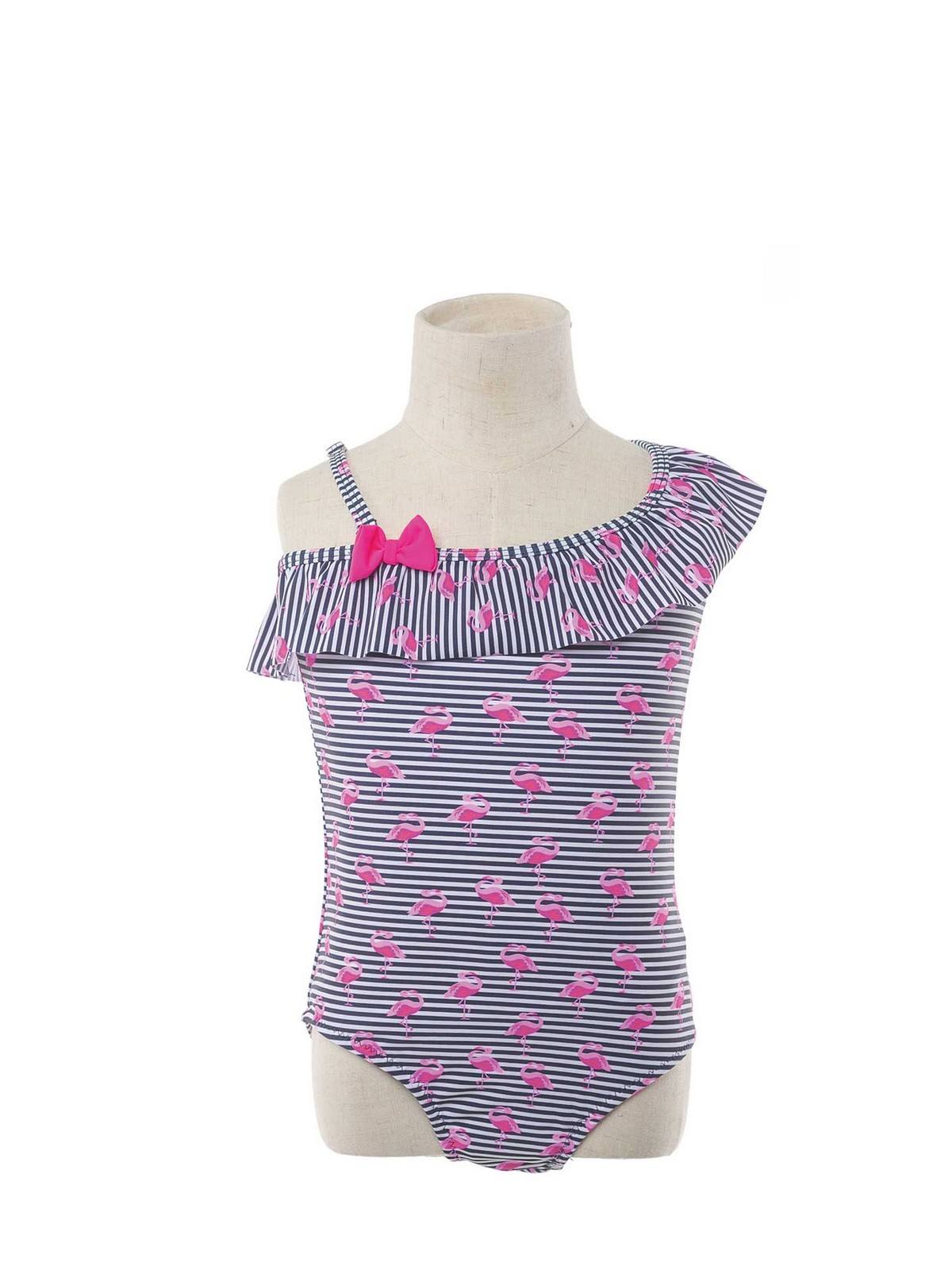 One-piece kids’ swimwear striped, with print flamingo and with one shoulder strap with wide with ruffles while the other side has thin straps and a bow. 80% polyester, 20% spandex