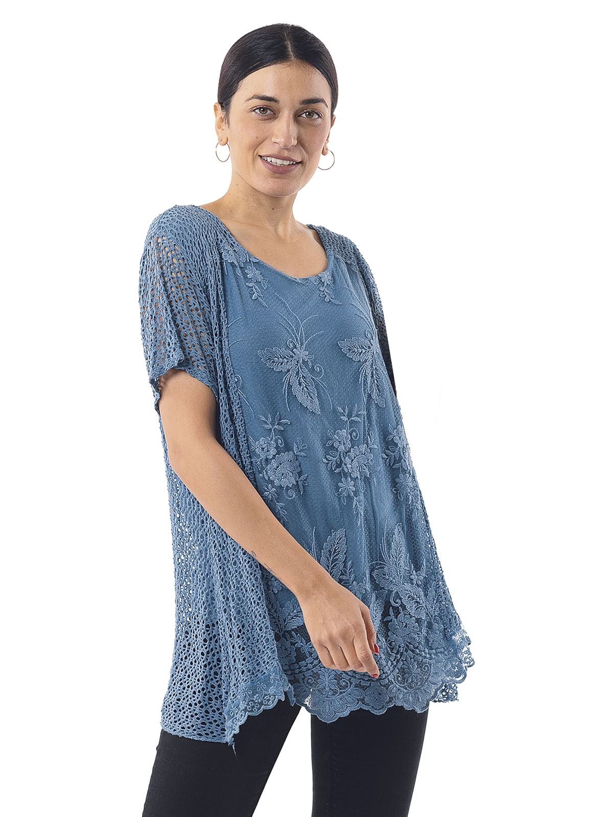 Perforated Plain blouse, with sleeves and lace with discreet embroidery. 95% viscose, 5% elastane