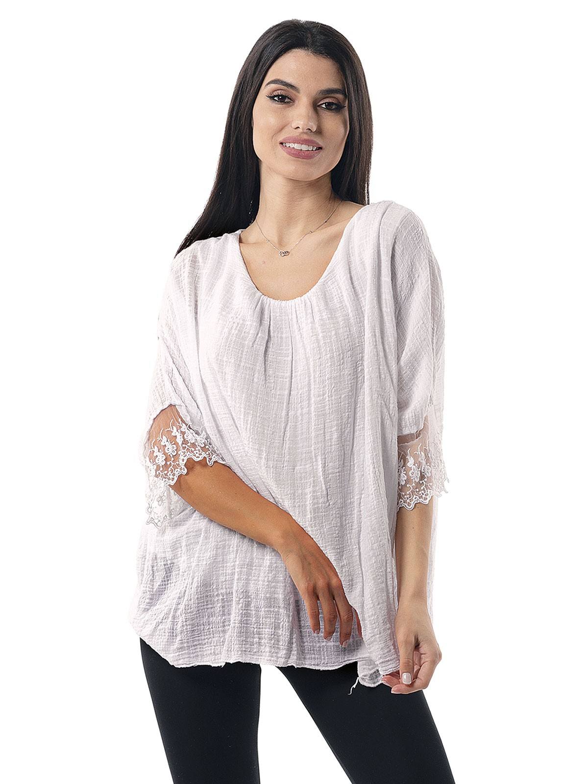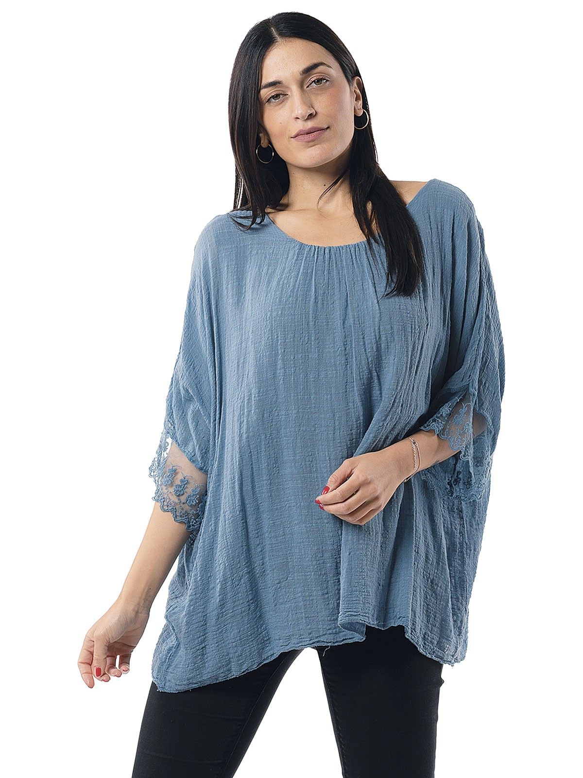 Plain blouse, with 3/4 sleeves that end in lace and elastic neckline. 95% viscose, 5% elastane