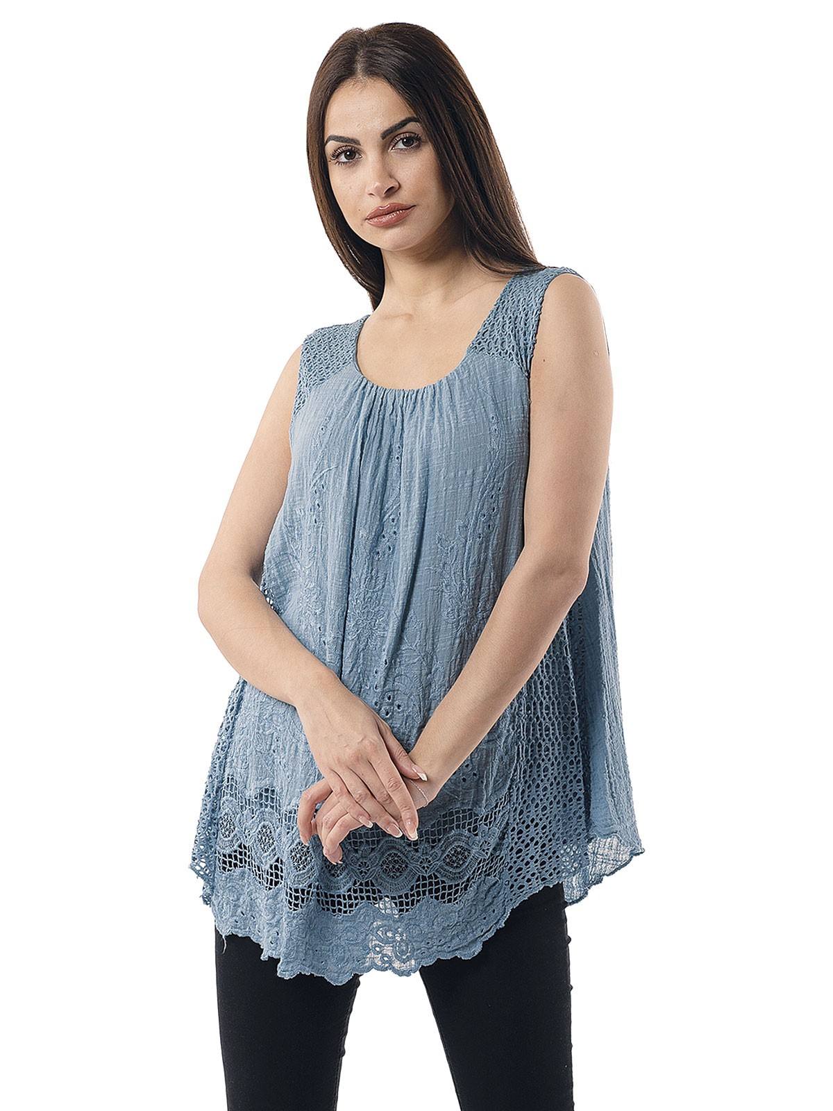 Plain blouse, sleeveless with fabric with perforated embroidery. 95% viscose, 5% elastane