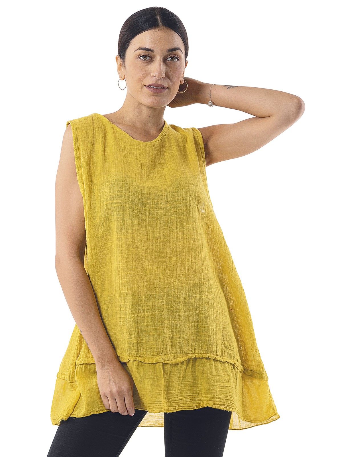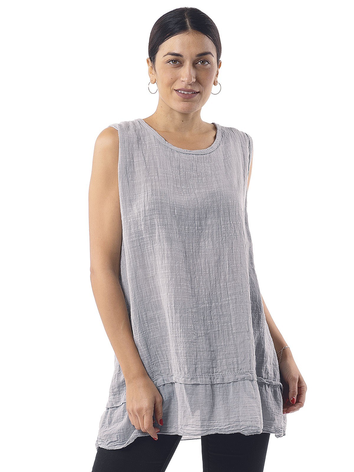 Plain blouse, sleeveless with ruffled hemline. 100% cotton