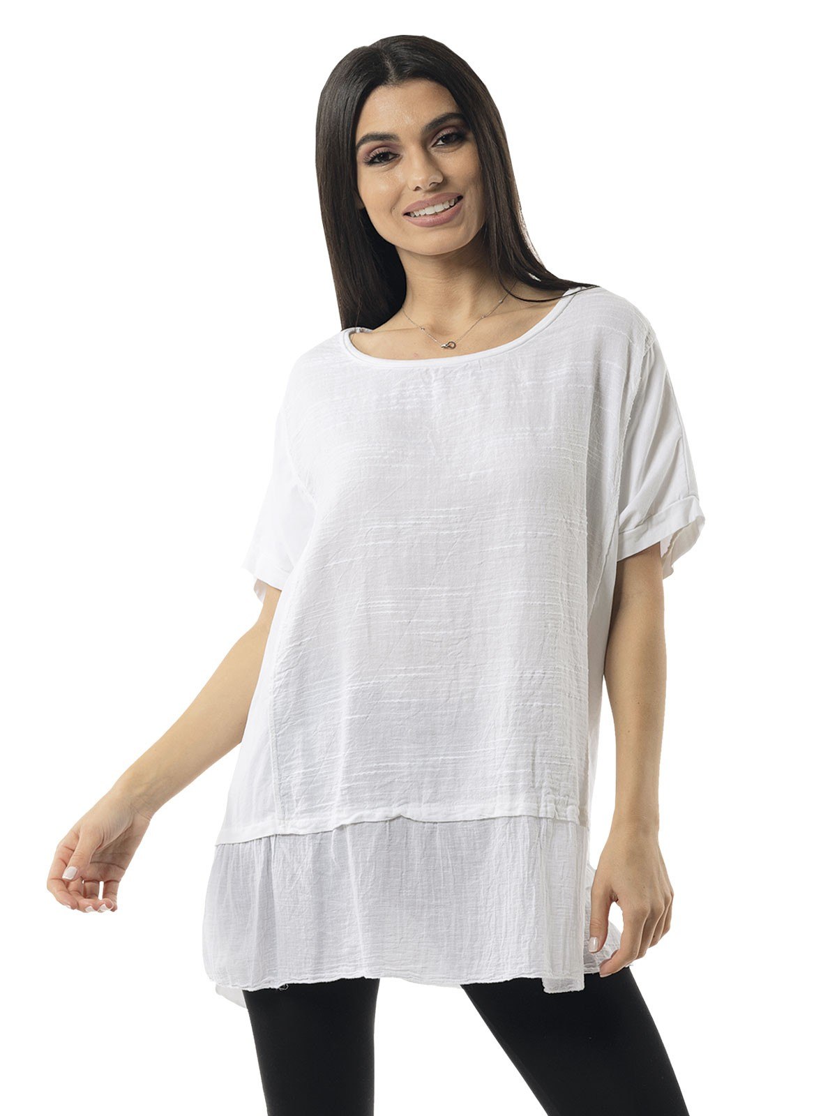 Plain blouse with sleeves and lightly ruffles hemline. 65% cotton, 30% linen, 5% elastane