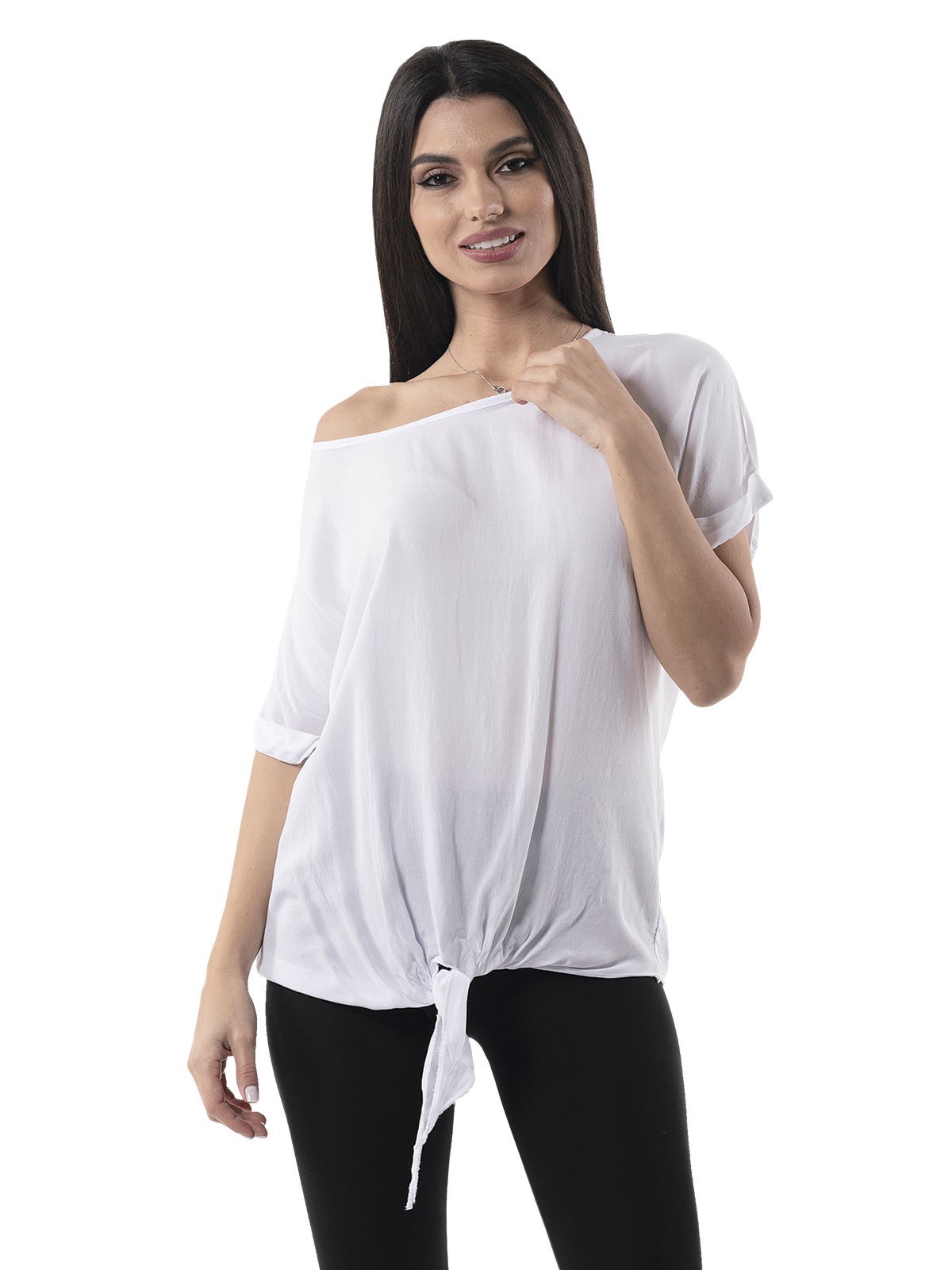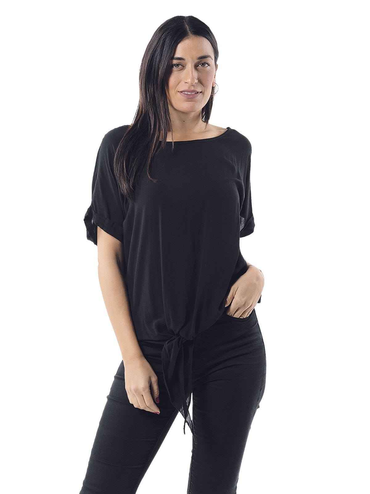 Plain blouse with sleeves and knot on the bottom front side. 100% viscose