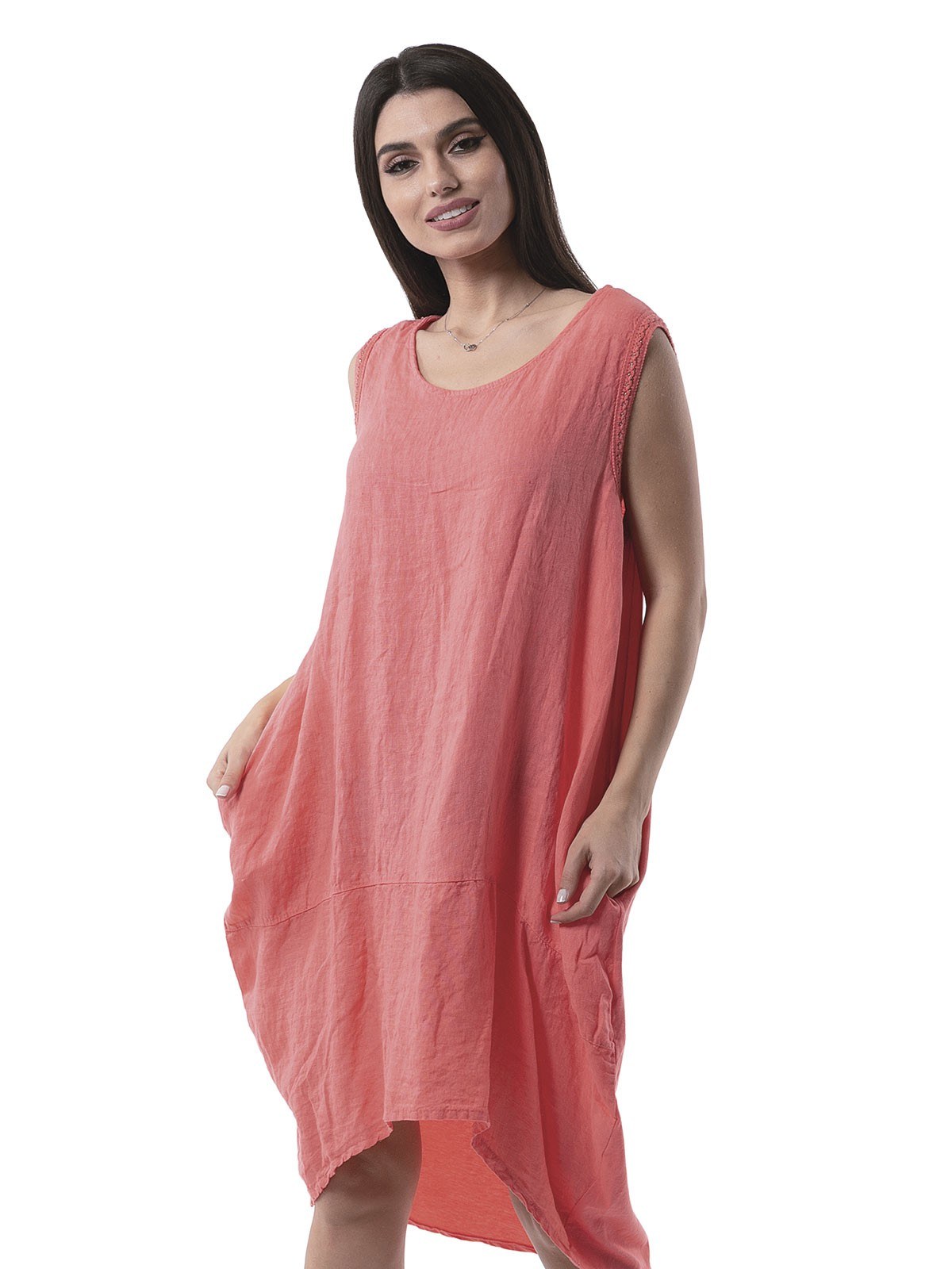 Dress cotton/linen sleeveless, plain with pockets on the side and uneven length, shorter on the front and longer on the back. 100% cotton, 100% linen