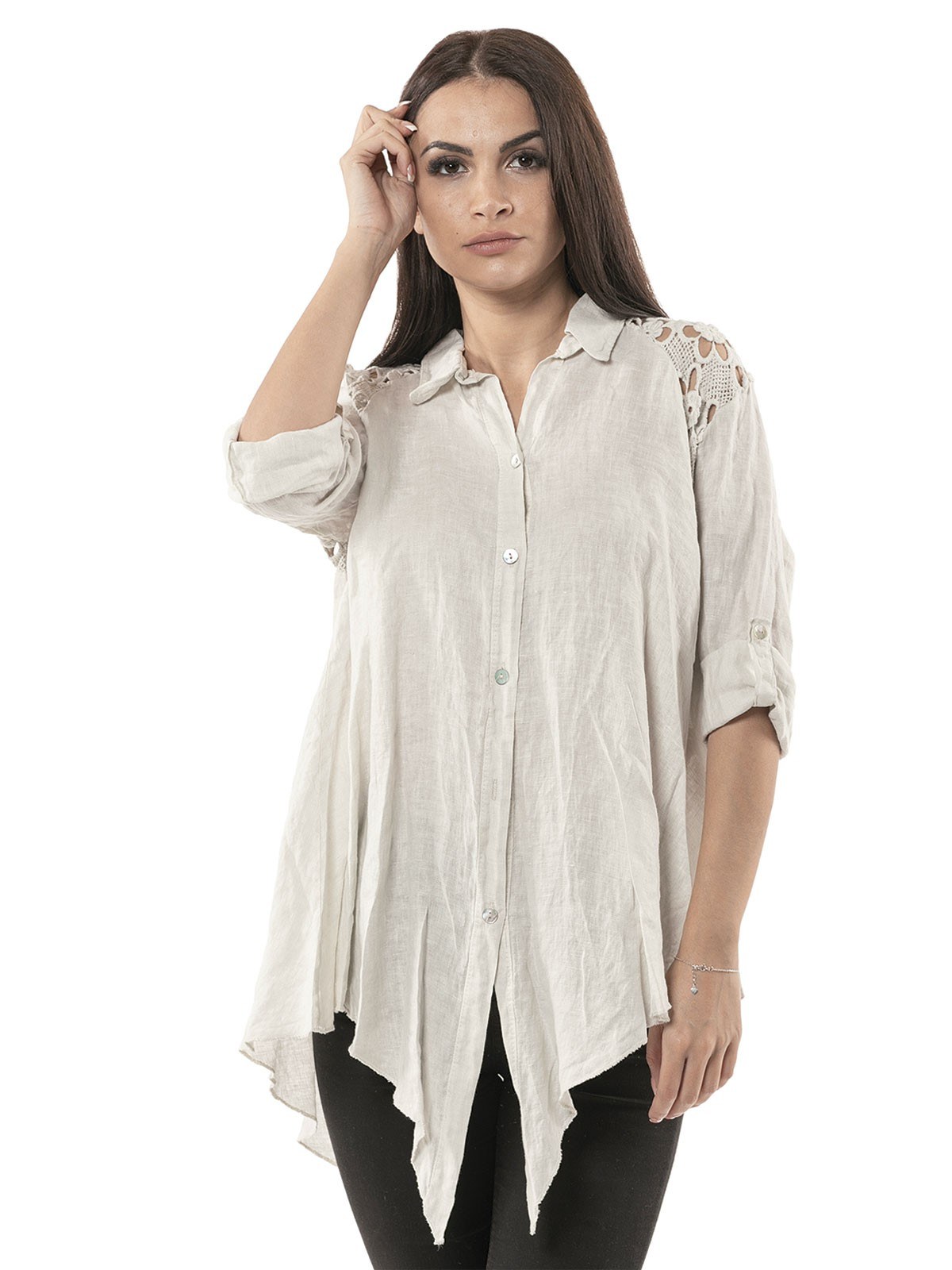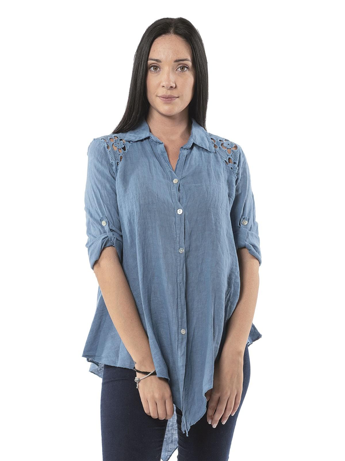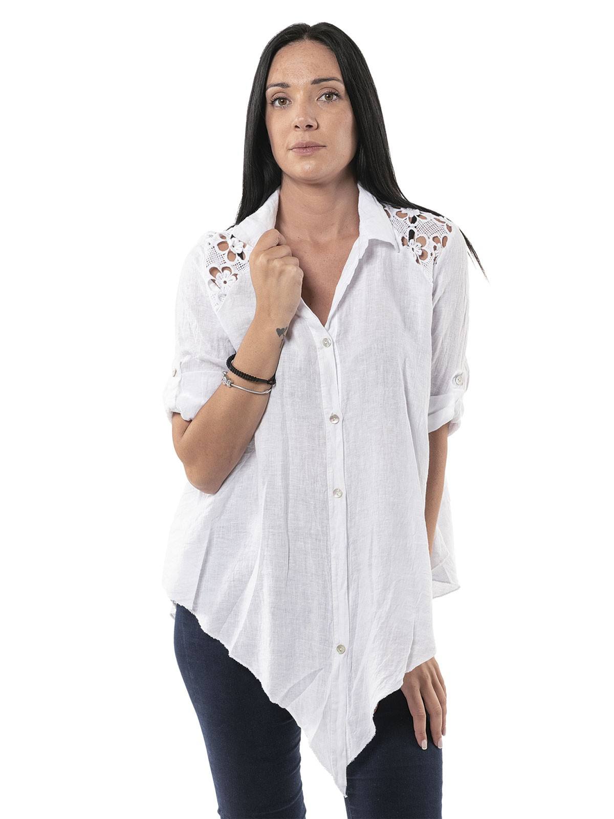 Shirt plain linen, with 3/4 sleeves,with fabric with perforated embroidery on the shoulders and asymmetric hemline. 100% linen