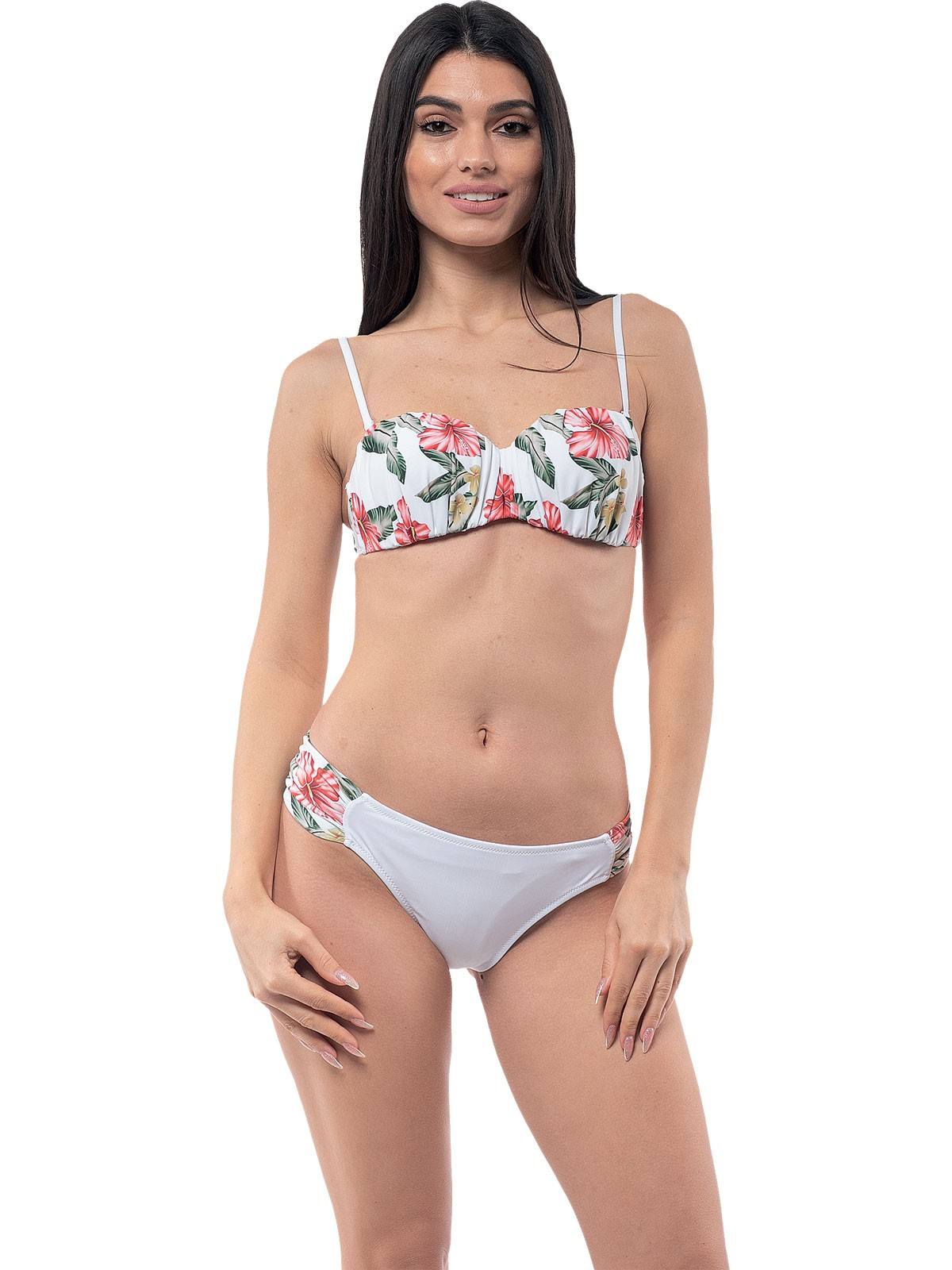 Bikini set printed.The top is strapless with busk and padding, Β CUP, with removable straps and fastening on the back while the bottom part is plain with printed on the sides and normal fit. 80% polyester, 20% spandex