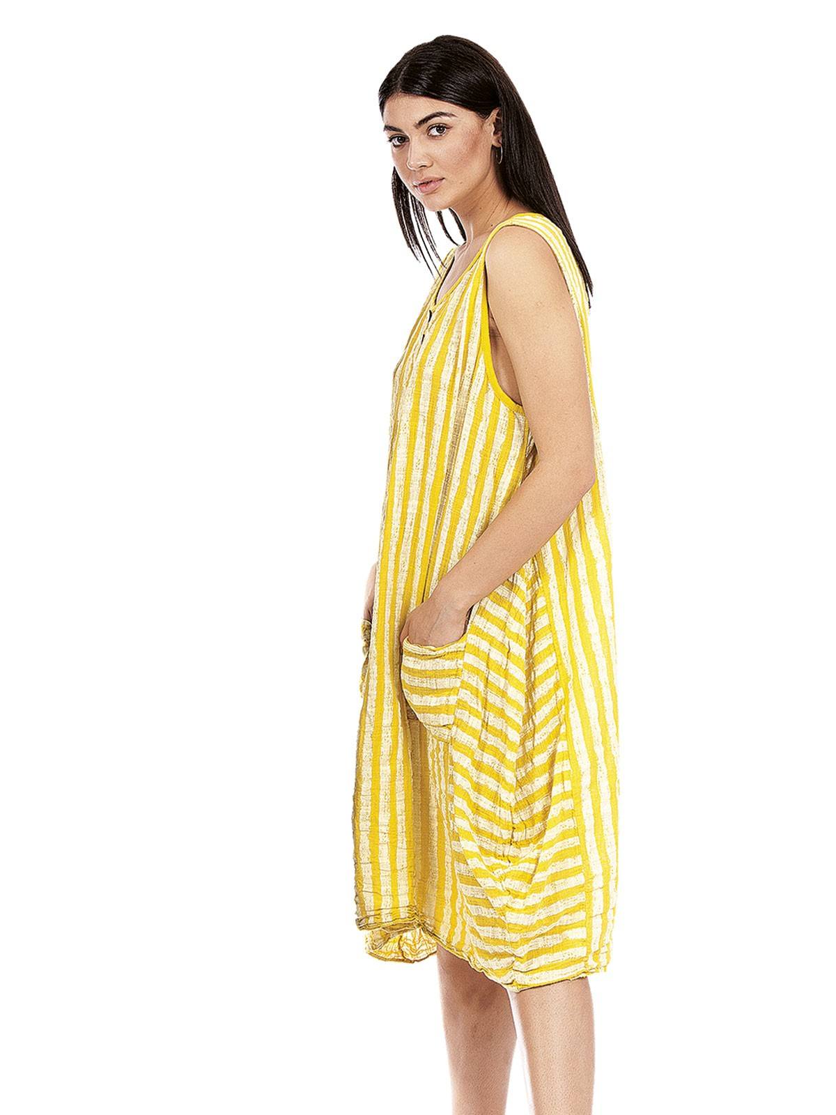 Short dress, striped, sleeveless with 2 buttons on the neckline and pockets on the bottom. 100% cotton