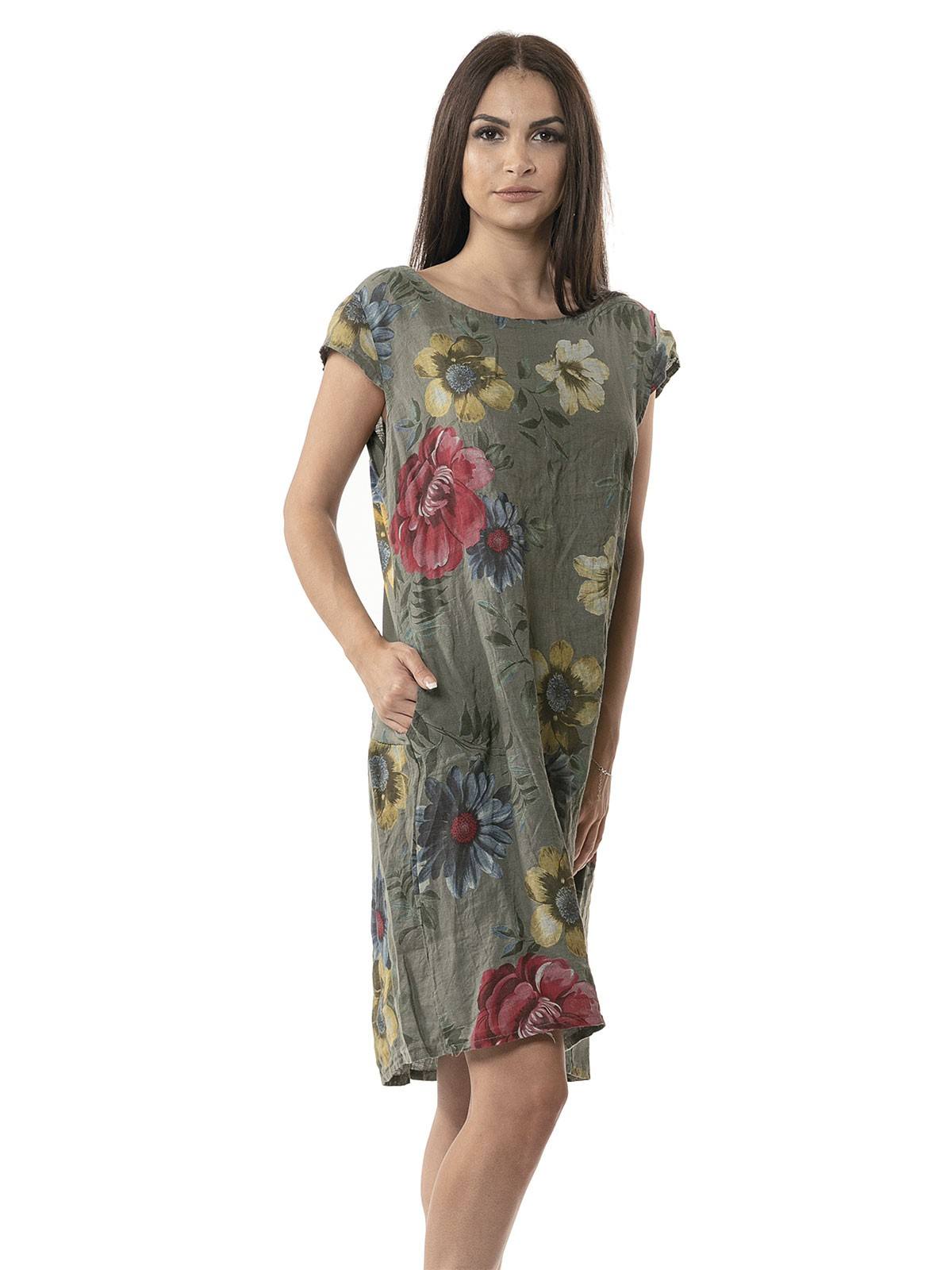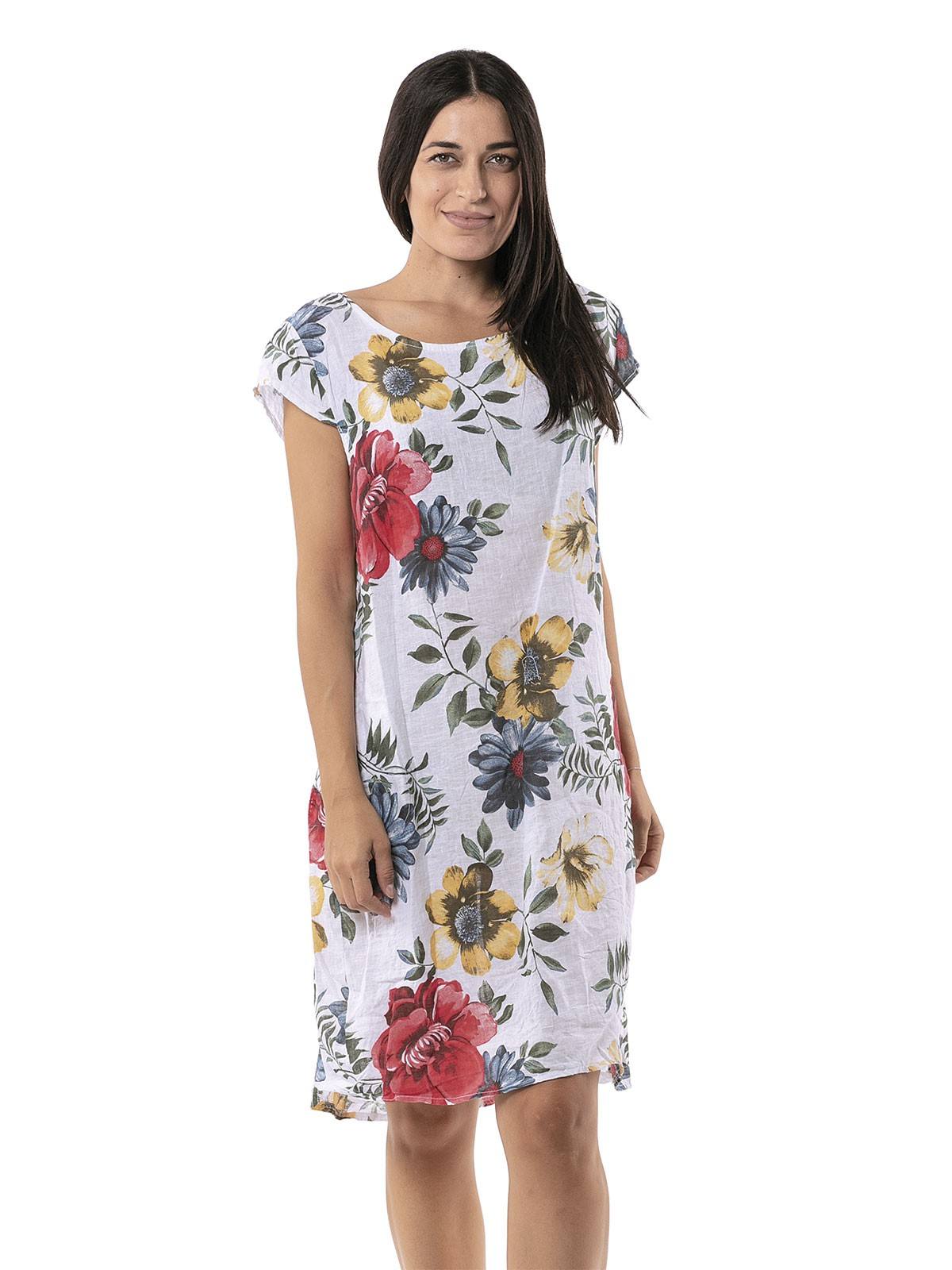 Short dress floral linen, with sleeves and pockets. 100% linen