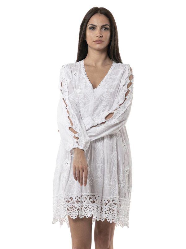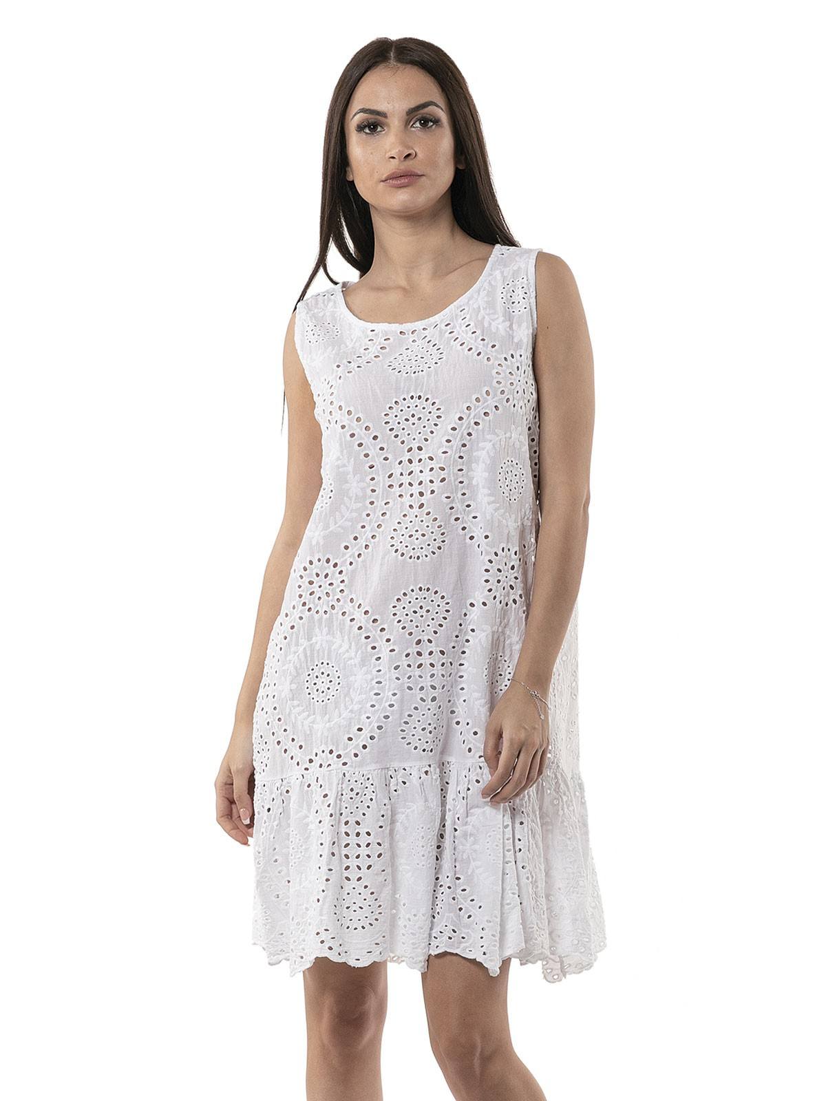 Plain short dress, sleeveless, with fabric with perforated embroidery and ruffled hemline. 100% cotton