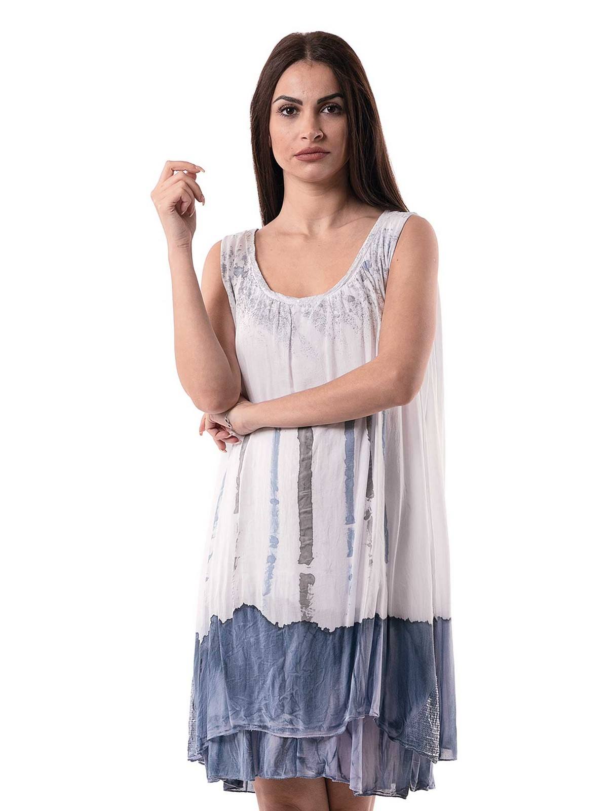 Short dress printed and on both sides, sleeveless with a pocket – sequins on the top and on the sides in the shape of a triangle. It has lining. 100% viscose
