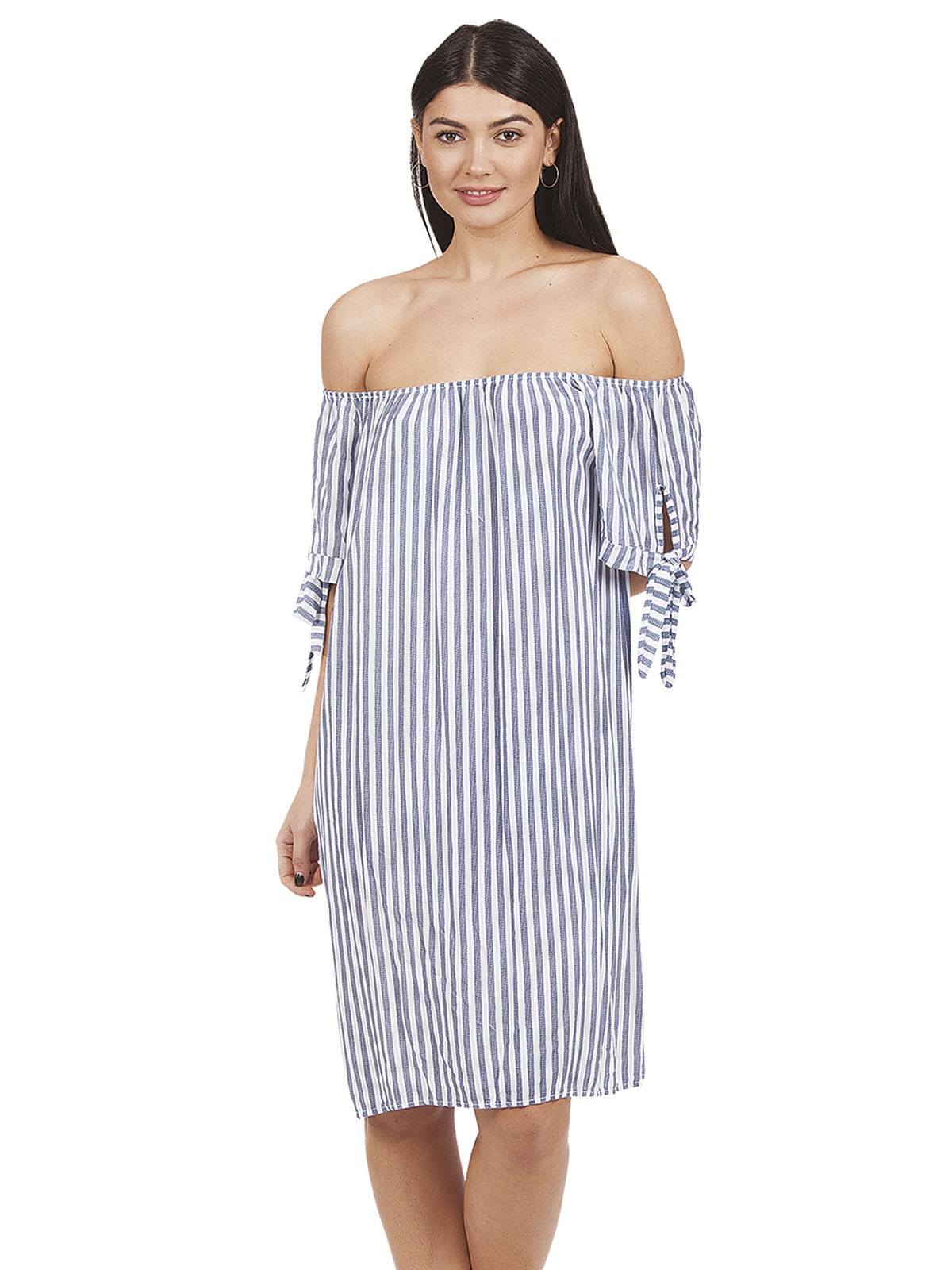 Dress striped White/blue short with bow on the sleeves and band on the neckline. 100% rayon