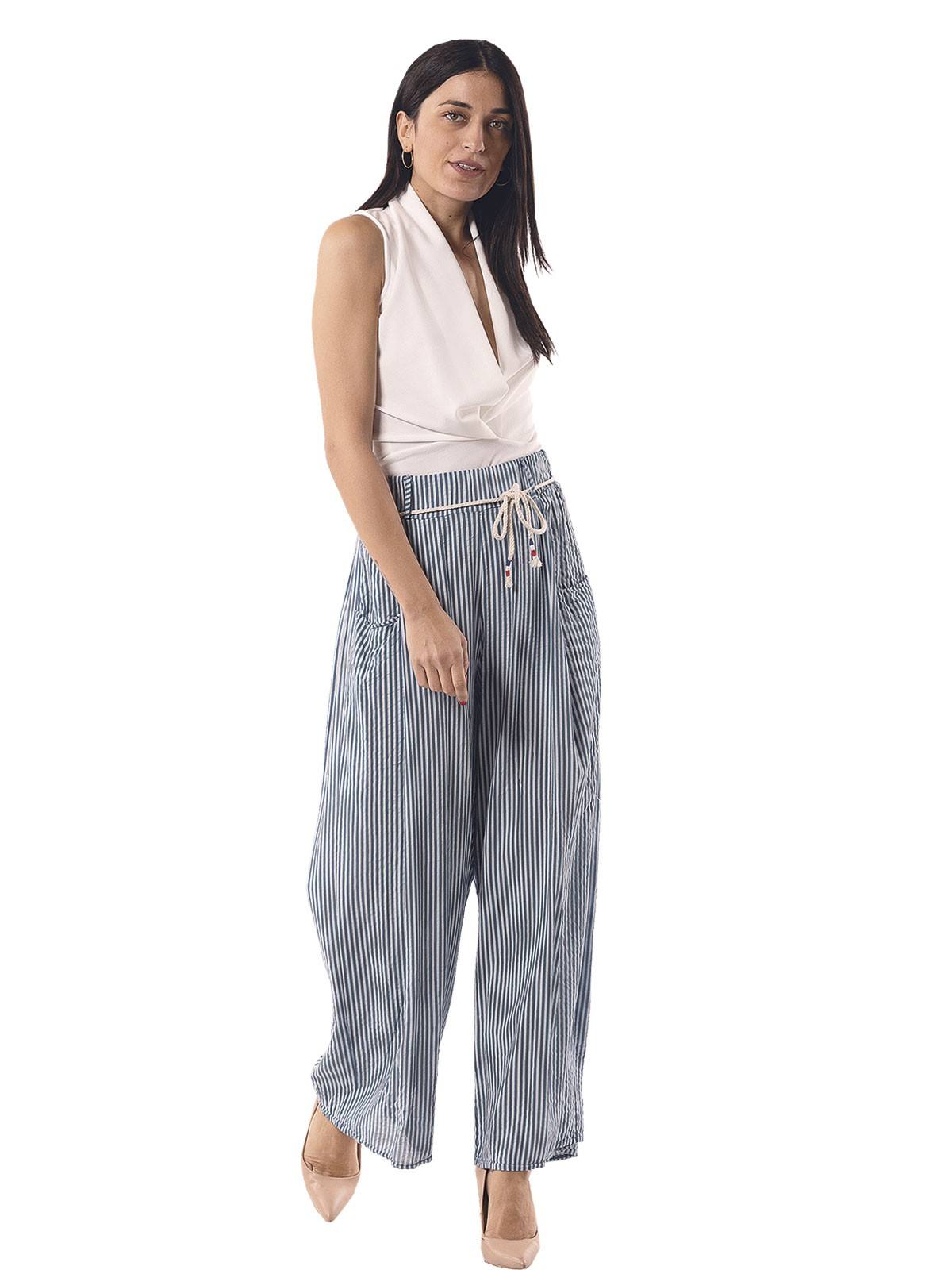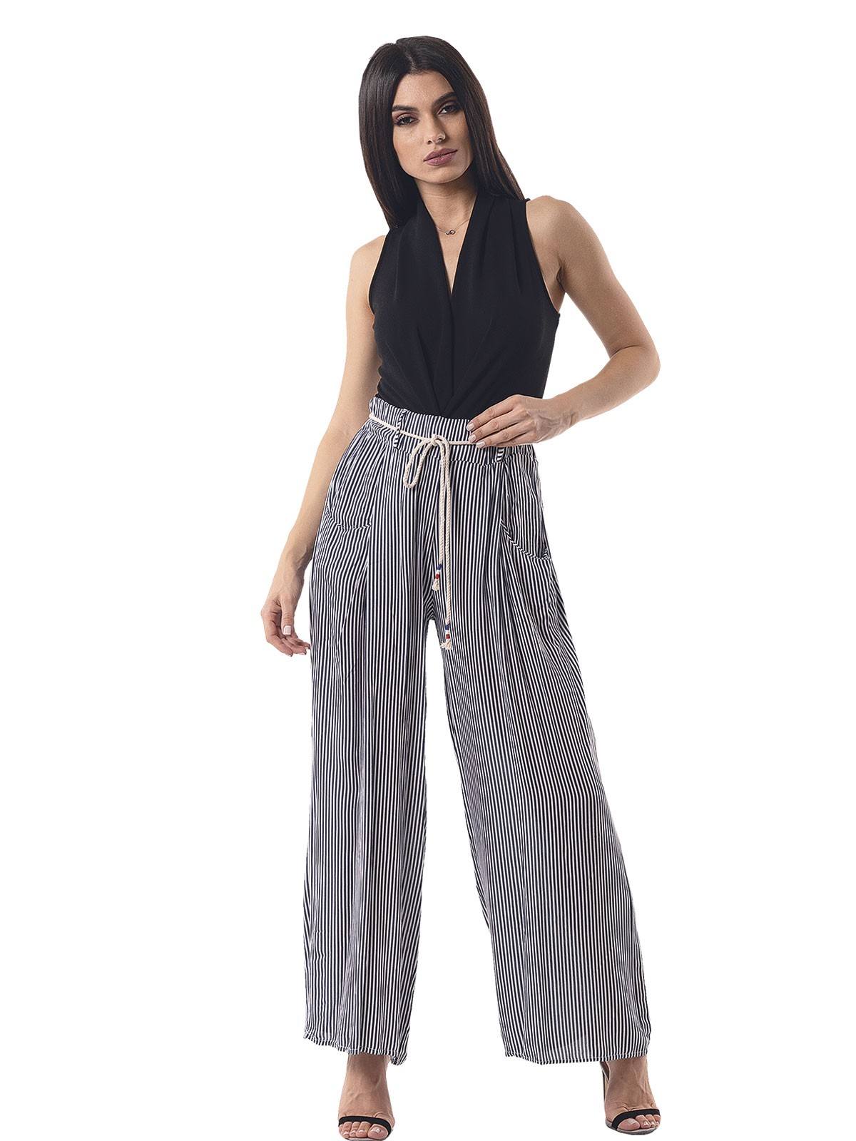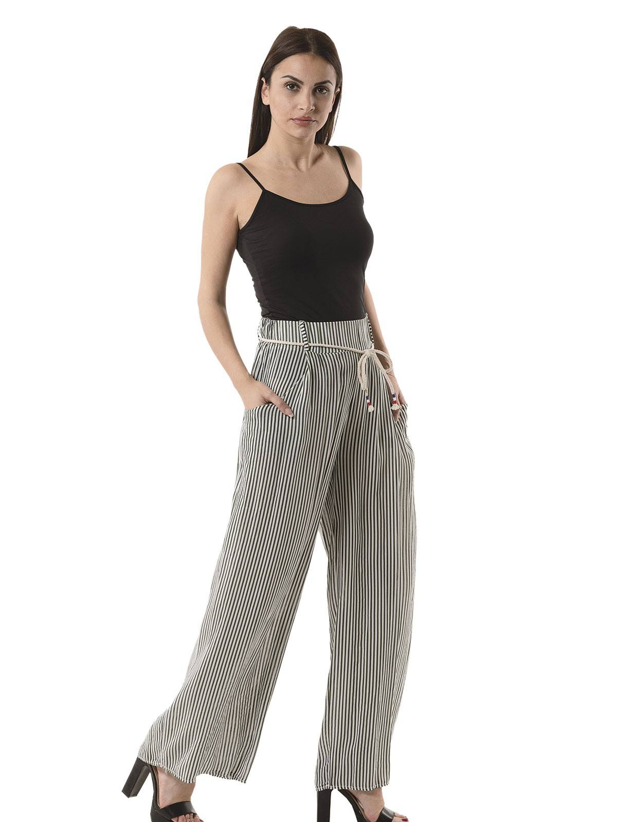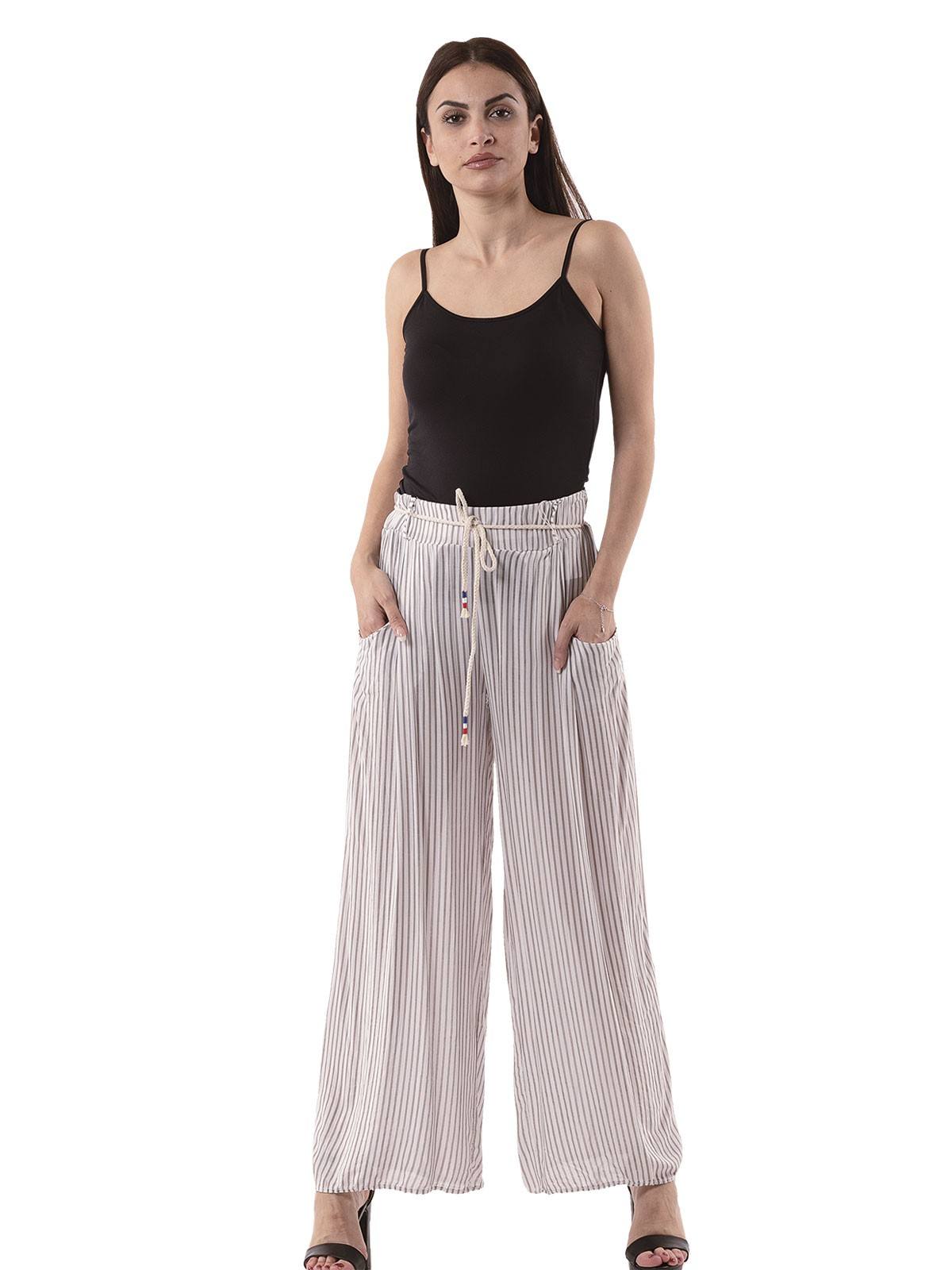 Striped wide leg trousers with band and cord in the middle, pockets on the sides. 100% viscose
