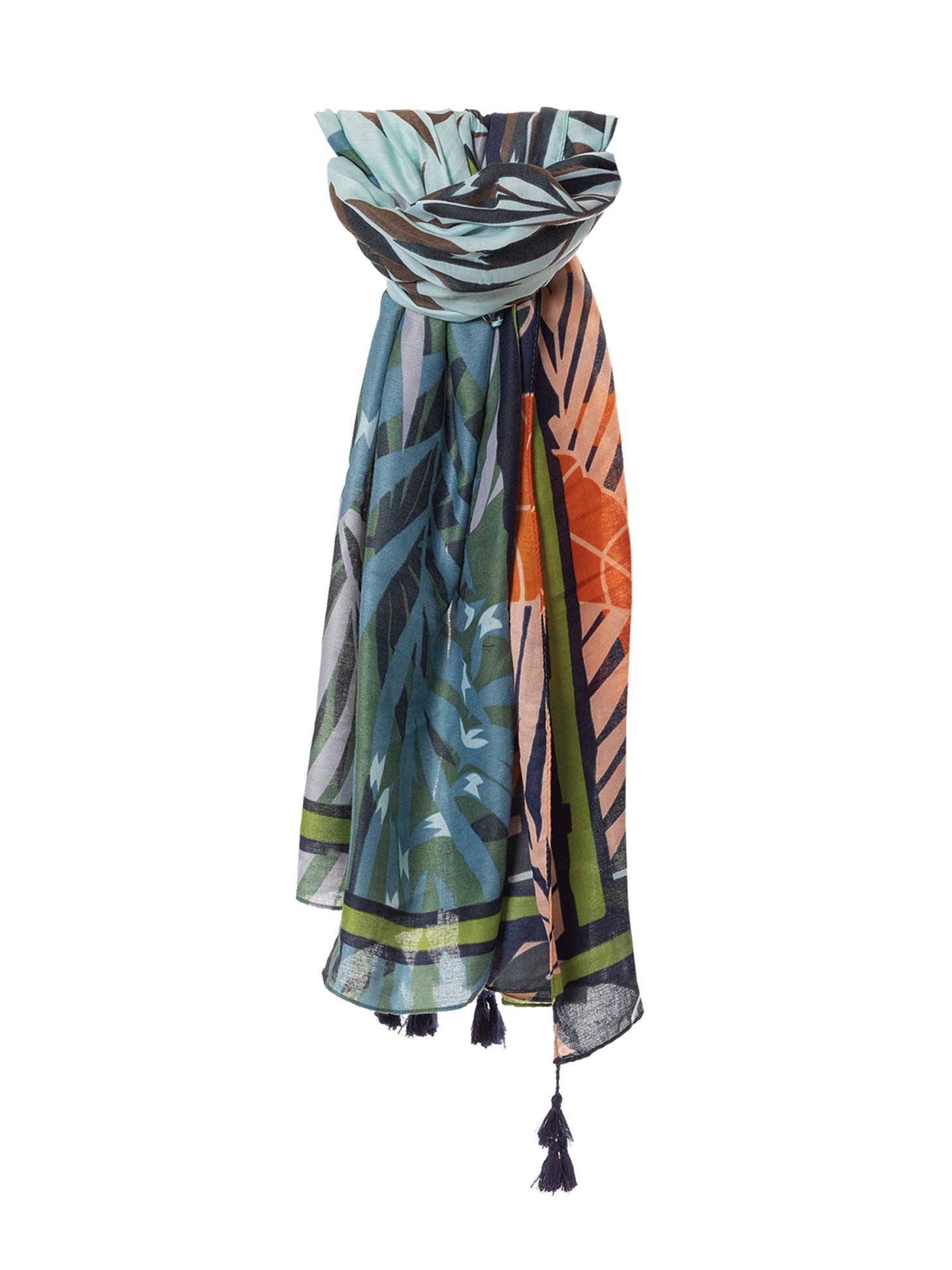 Φουλάρι γυναικείο εμπριμέ σε μπλε και πράσινες αποχρώσεις. 100% polyester
